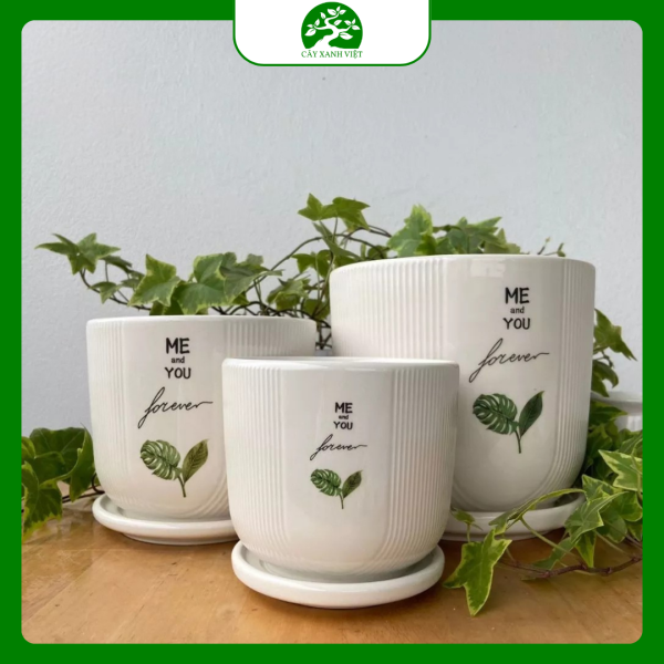 Bộ chậu sứ trắng “Me and You Forever” được thiết kế tối giản nhưng sang trọng, kết hợp tinh tế giữa sắc trắng thuần khiết và họa tiết lá xanh tươi mát. Câu chữ “Me and You Forever” mang thông điệp gắn bó, bền lâu – rất thích hợp để trang trí hoặc làm quà tặng ý nghĩa cho người thân, bạn bè, đặc biệt là các cặp đôi yêu cây cảnh.